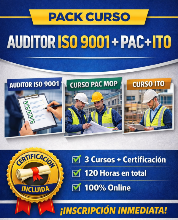 El Pack Auditor ISO 9001 + PAC + ITO es una formación completa y estratégica orientada a profesionales que participan en obras de construcción, contratos MOP y sistemas de gestión de calidad, entregando las competencias necesarias para planificar, ejecutar, auditar y controlar la calidad en terreno y a nivel organizacional.